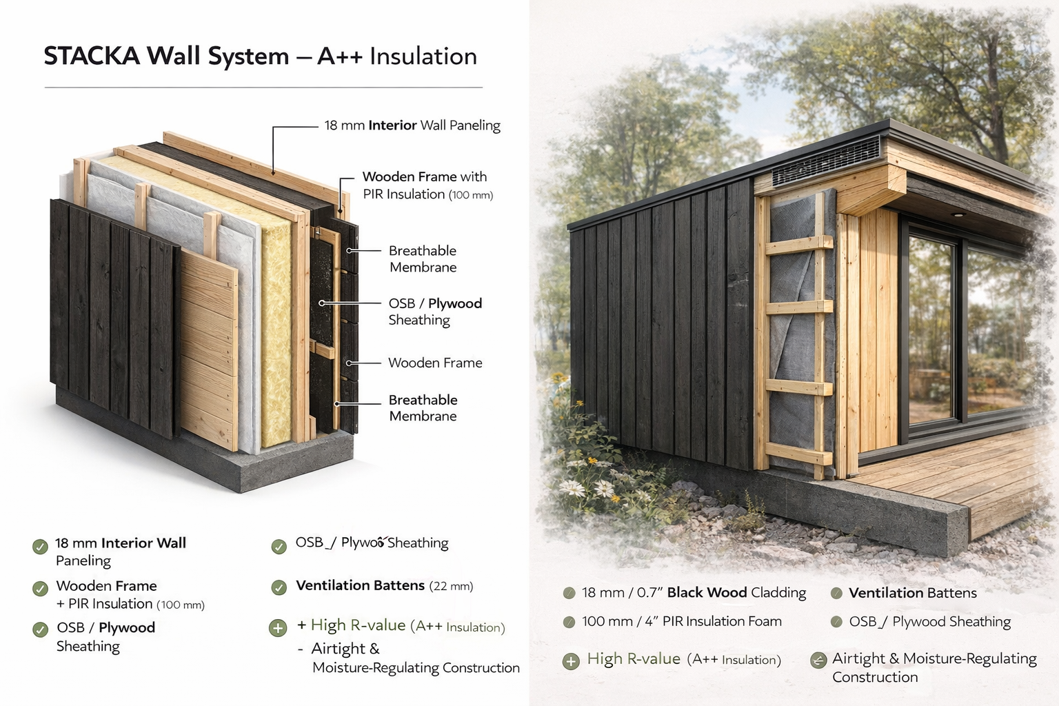 - Sandwichopbouw met isolatie + buitenbekleding (hout/composiet)