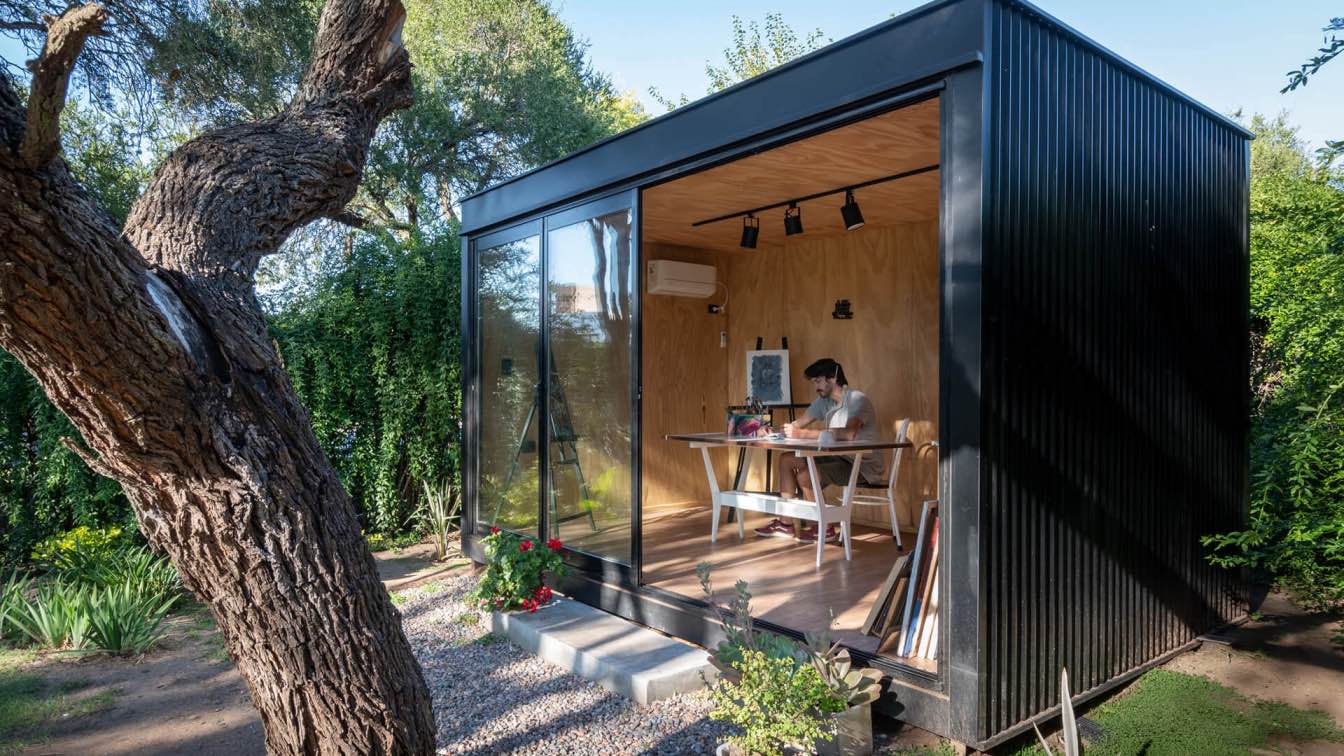 Tuinkantoor: Rustige werkplek met veel licht, natuurlijke materialen en een professionele uitstraling.